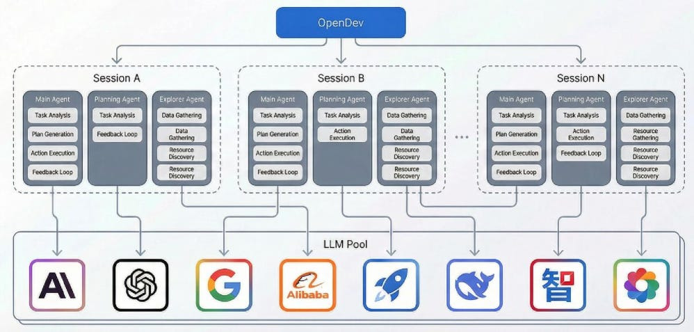 - 각 작업은 세션 단위로 진행되며, 세션 내에는 여러 전문화된 서브 에이전트가 존재해 서로 다른 LLM에 연결될 수 있음.